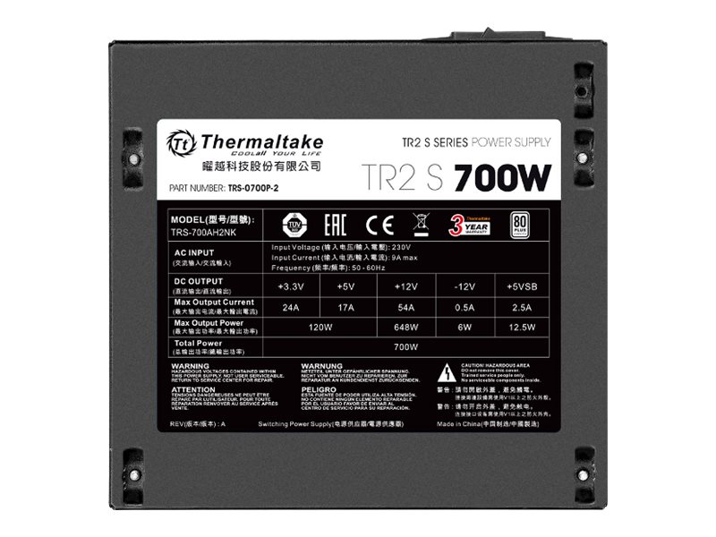 Thermaltake TRS-700AH2NK - 700 W - 230 V - 50 - 60 Hz - 9 A - Attivo - 120 W - TR2 S 700W - ATX 12V 2.3 - Active PFC - 120mm fan - 2x PCI-E 6+2pin - 1x 4+4pin - 6x SATA - 5x 4pin - 1x FDD - Black
