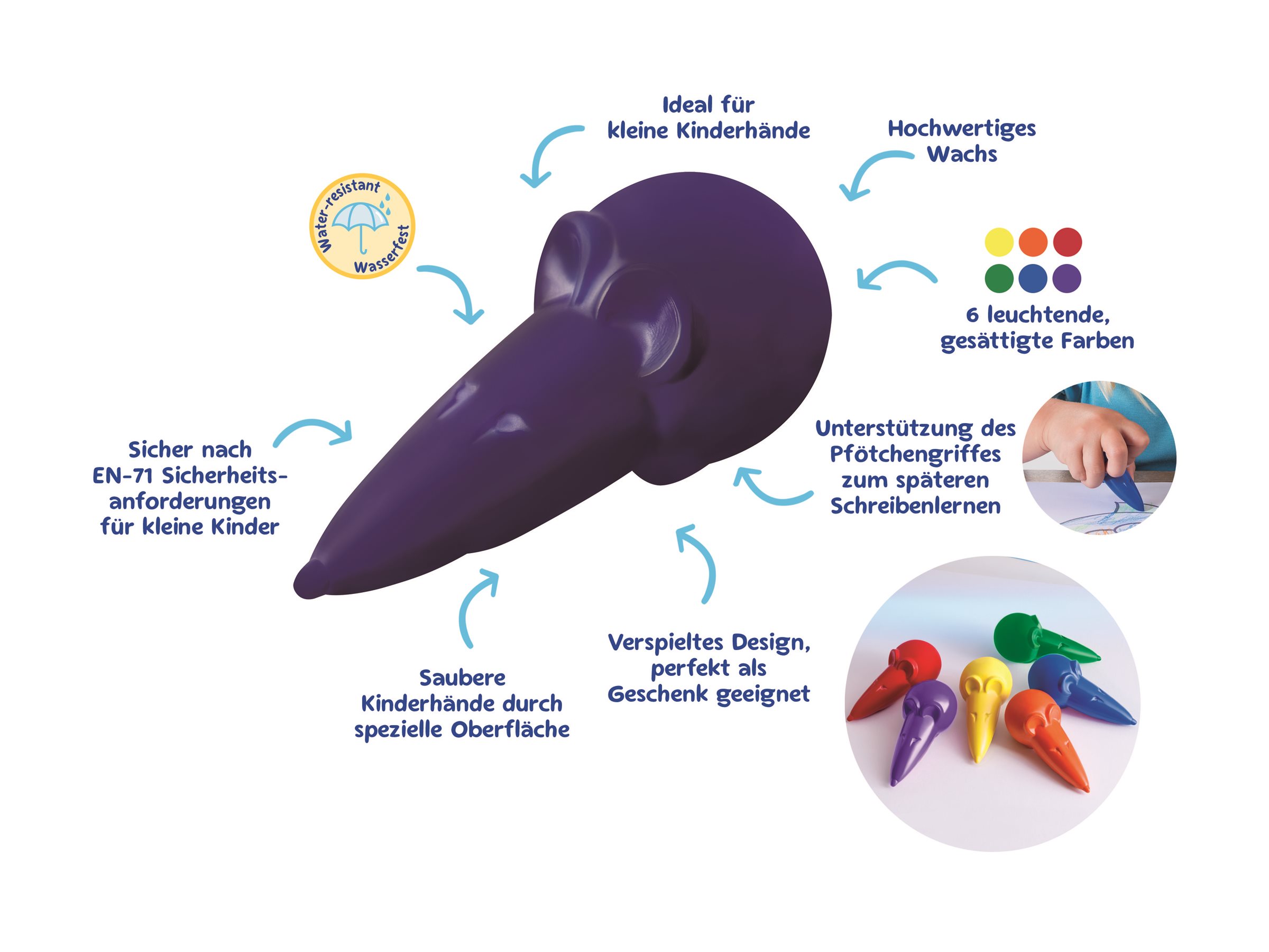 - Blau; Grün; Orange; Rot; Violett; Gelb